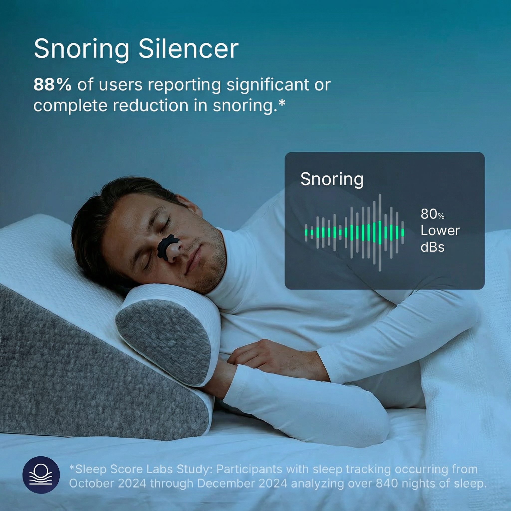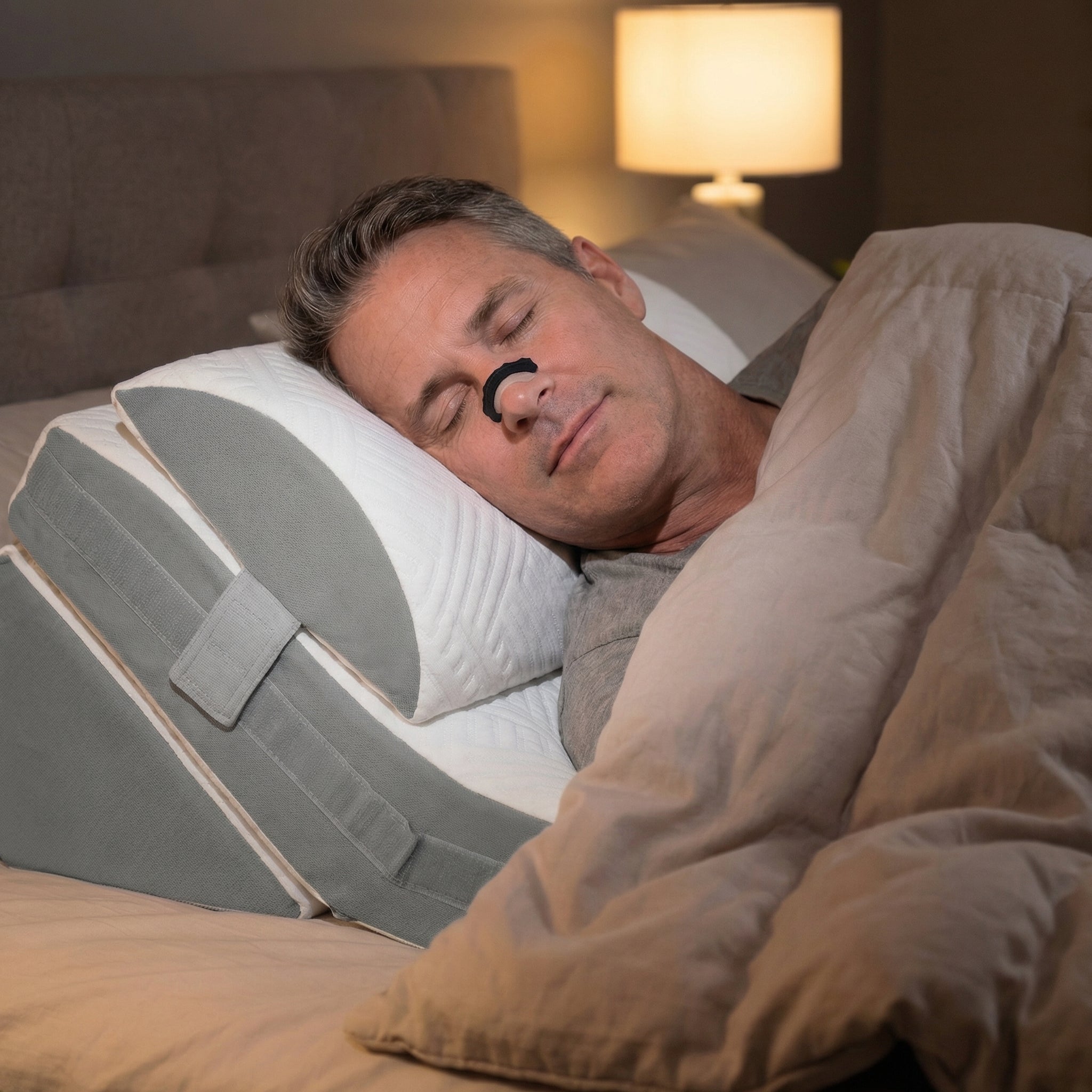 Nasal strips and ergonomic pillow work together to reduce snoring naturally.